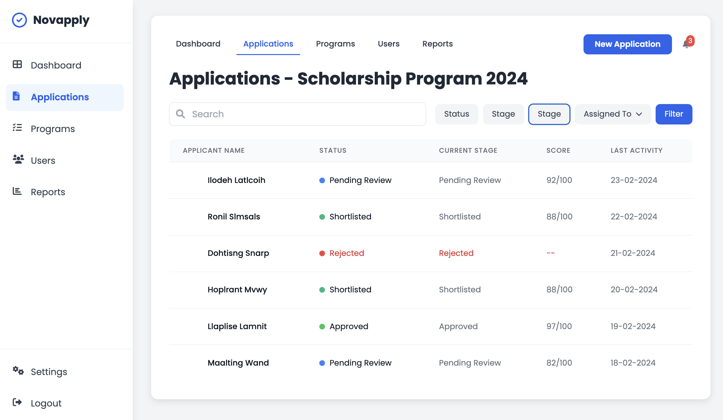 From the main Dashboard, use the filter buttons located above the applications table. You can filter by Status (Pending, Shortlisted, Rejected, Approved), Stage, or by the specific team member Assigned To