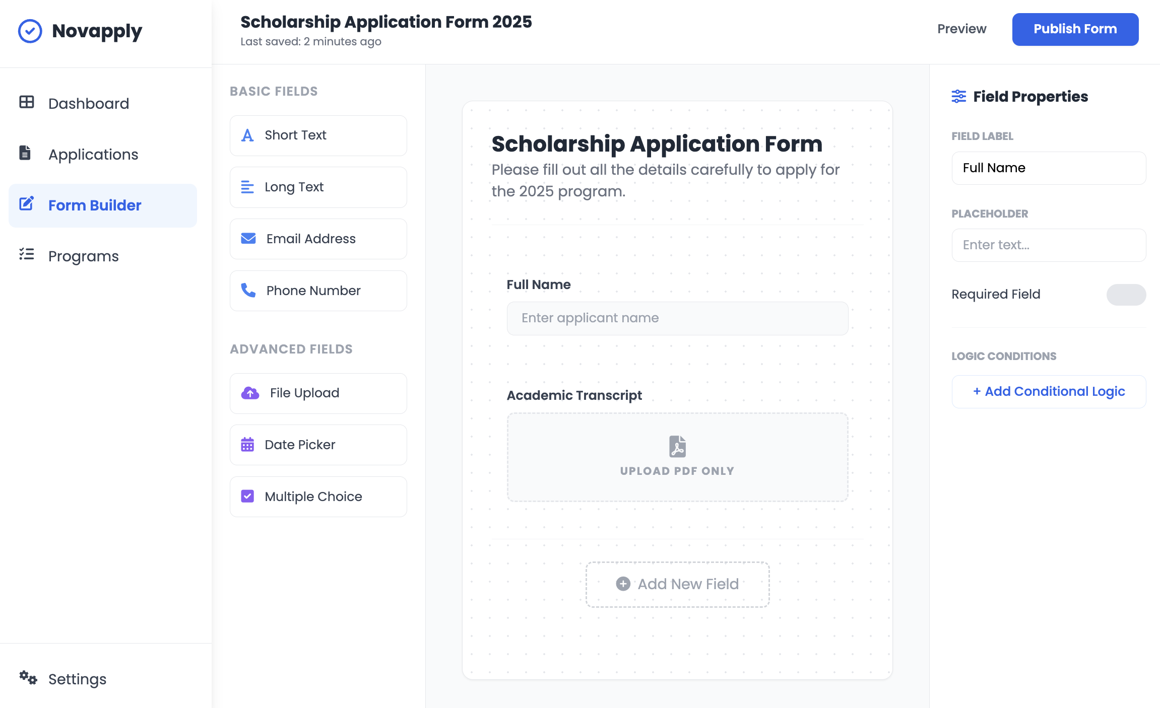 It is a feature that allows you to show or hide fields based on the applicant’s previous answers. You can configure this in the “Logic Conditions” section within the field properties.